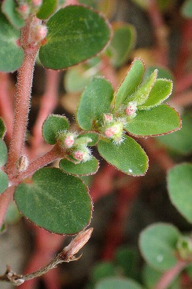 花は葉腋に杯状花序を付け、腺体は赤い。果実(刮ハ)は扁球形、長径1.3ミリほど。白毛が密にあり、特に3個ある稜の部分には特に多い。花期は5〜11月。