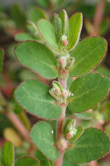 原産地不明の帰化植物。空き地、道路のコンクリートの隙間・道端などに生える1年草。茎は基部でよく分枝し、地を這うかやや斜上し、全面に毛がある。葉は対生し、楕円形〜長楕円形、先は円頭〜微凹頭、縁は低い鋸歯がある。表面は灰緑色で赤い紋様はなく、裏面は白緑色で白軟毛が密にある。