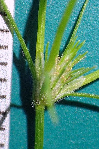 湿泥地、田の畦、休耕田などに生える1年草で、高さは10〜20センチ。叢生し、植物体全体に毛がある。葉は糸状で柔らかい。