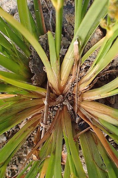絶滅危惧種1B(EN)で、畑など平地に稀に生える1年草。根茎はなく、小さな株を作る。茎は細く、高さ7〜40センチ。葉は無毛、鞘の口部外側に短い毛がある。