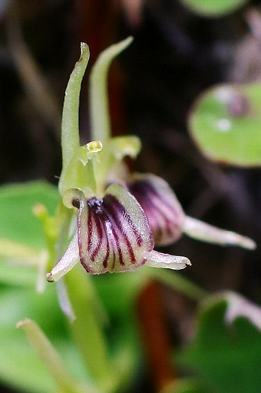 花は茎頂の総状花序に3〜4個付く。苞は卵形で、長さ1.5ミリほど。背萼片と側萼片は披針形、淡黄緑色、長さ4ミリほど。側花弁は糸状で後方に巻き、長さ5ミリほど。唇弁は倒卵形、暗紫色で紫褐色の筋が入り、長さ4ミリほど、先は微細な突起があり、基部はくぼんで、中部から先はやや内巻きになる。蕊柱は内側に湾曲し黄色、葯は卵形。花期は6〜7月。本州(岩手・栃木・山梨・長野県)に分布する。