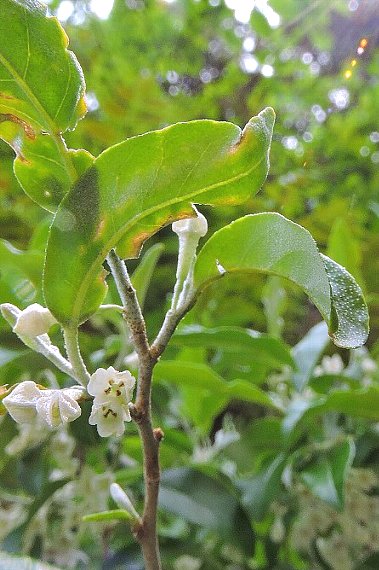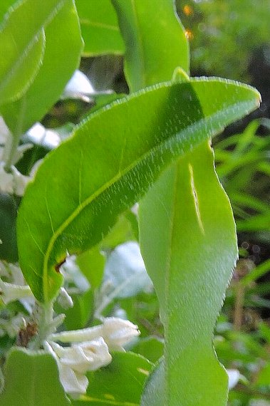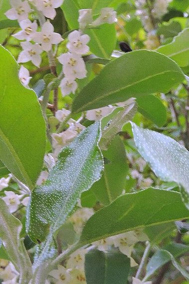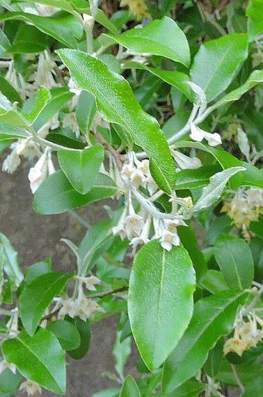 アキグミと思っていましたが、後年精査してみましたらカラアキグミのようです。アキグミの変種で、葉表は緑色で、鱗状毛はなく、代わりに星状毛が見られます。葉裏はやや白いものも鱗状毛は少ないようです。新枝は鱗状毛で覆われ、白く見えます。