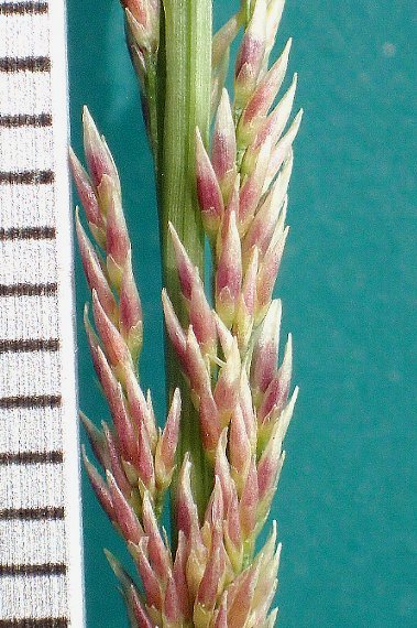 | 2025.9.22 神奈川県川崎市 小穂は長さ2ミリほどで、赤紫色を帯びています 第1苞頴は第2苞頴よりも長いようです |