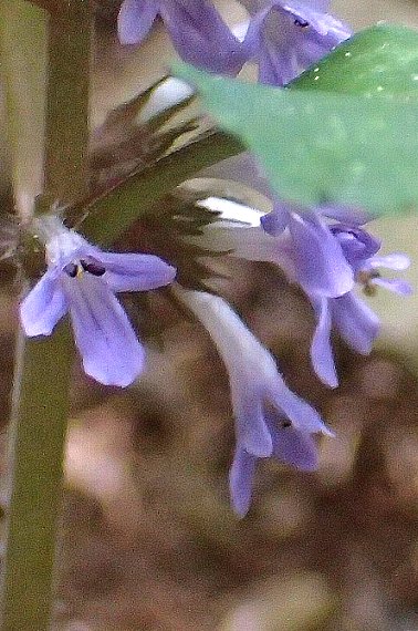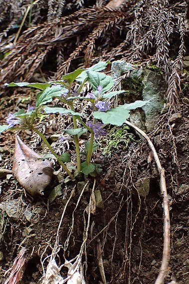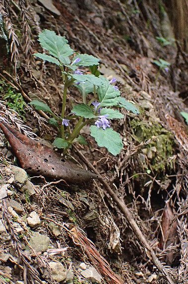 近年になってジュウニキランソウの名を知り、交雑の一形態と思いました。茎は立ち上がり、背丈は15〜20センチほど、葉は対生していました。花は葉腋に2〜5個ずつ付いているようで、キランソウより薄く淡紫色です。