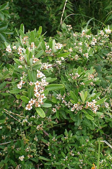 花は葉腋に散房花序となって5〜10個付き、花弁は5個、白色で直径8ミリほど。萼や小花柄には葉裏と同様灰白色の軟毛がある。果実(梨果)は平たい球形、直径5〜8ミリ、橙黄色に熟し、先端に萼片が残る。別名ホソバトキワサンザシ 花期は5〜6月。