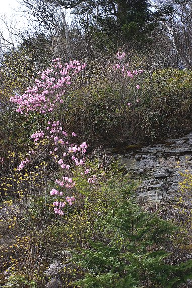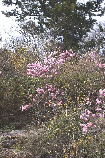 | 近畿地方以西、四国、九州の深山に生える落葉低木で、高さは3〜5メートル。枝分かれがよく、輪生状に5枚の葉を付け、葉よりも先に淡紅色の花を付ける。花期は4〜5月。 〜徒然想〜 アケボノツツジの名は、地元の愛好家の方に教えてもらいました。指差す山の山頂に、淡いピンクの木が見えます。 残念ながら、山頂までは片道30分余りかかるとのことで、時間のない旅人は断念です。 車道からもいくつかみられ山を彩っていますが、いずれも距離があり、花のアップは撮れませんでした。 夜明けのあけぼの色にたとえて名前が付けられたとか、ほんとに赤みの少ないいい色具合です。 遠見でも、花は丸みがあり、柔らかな感じが分かります。 −同じ科の植物− |