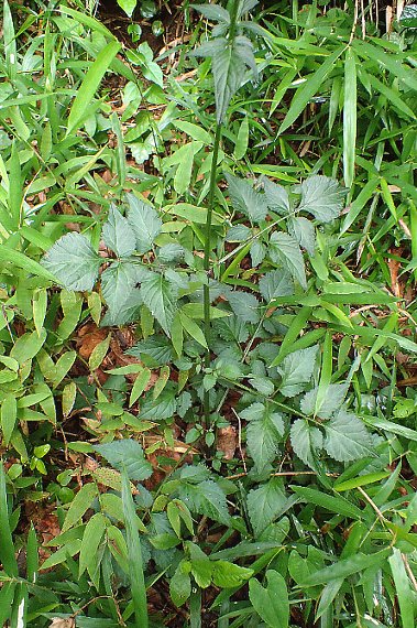 山野に生える多年草で、高さ20〜80センチ。葉は対生し、1〜2回羽状複葉、稀に単葉。小葉は3〜7枚で広卵形、縁には鋸歯がある。下部の葉には長柄がある。 茎の上部に長さ10〜25センチの花穂を出し、長さ1〜1.3センチの淡青紫色の唇形花を数段輪生する。花冠の外側には白い毛が多い。花期は7〜11月。本州〜沖縄県に分布する。 〜徒然想〜 すぐ下に民家が連なり、木を切るチェーンソーの音が響き渡ります。民家からみれば、ここは家の裏山にあたります。そんな所でも、コンクリートに囲まれた都会人には新鮮な場所です。裏山に続く道は陽当たりがよく、次々に山の花が現れます。 アキノタムラソウは、夏から秋口に山間を歩くとよく見られます。丘陵や海岸付近の草地でも見られることがあります。 雄しべが花冠より飛び出さないのが特徴で、対し、ミヤマタムラソウは明らかに飛び出します。 −同じ科の植物−