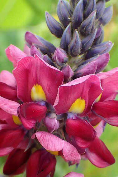 山野に見られるツル性の半低木で、基部は木質、上部は草質となり、長さ10メートルにものびる。根は長大で多量の澱粉を蓄える。葉は3小葉、両面に毛があり、特に裏面に白毛を密生する。 花は紅紫色で、総状に多数付く。花期は7〜9月。 根の澱粉は葛粉としてよく知られ、乾燥したものを風邪薬の葛根湯に用いる。 〜徒然想〜 木の高みで見ることが多い。高尾山では7,8メートルもの高さのところにこの花がみえ、撮影もままならなかったことがあります。ツルをのばすパワーには驚きます。少しでも陽射しを受けようとするのでしょう。 愛知でも3メートルほどの高さに張り出した枝を横に伝わり、いっぱいに陽を受け鎮座していました。 高みで見ることが多いとしていましたが、多摩川河川敷ではアレチウリに混じり河岸を覆っていました。 −同じ科の植物− |