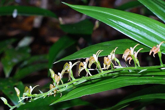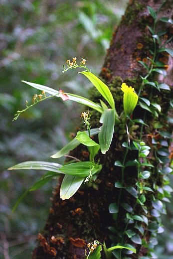 | 常緑広葉樹林内の岩上又は樹上に着生する多年草。葉は狭長楕円形で、鋭尖頭。 花は淡黄緑で、3〜15花が一方に偏った総状に付く。側花弁は線形で、唇弁はくさび状倒卵形。子房がねじれないので、唇弁は上向きに付く。 〜徒然想〜 もうすぐ出逢える・・・・・!! 9月に確認した株が、今を盛りに花を咲かせているという。見覚えのある道を奥に進むにつれ、どんな姿で花を咲かせているのか、ワクワク!ドキドキ!次第に胸が高まります。 出逢いはもちろん感動的です。20センチほどの太さの幹に花茎を横にのばし、小さな花を付けています。まるで、かわいい虫たちが枝に並んでいるようです。 関東方面の花がほぼ終わって1ヶ月あまり。機会があり沖縄に渡りましたが、そこにはすばらしい花たちと沖縄の方々の温かい心がありました。2007年の締めくくりに相応しい。 そして、新しい年がはじまります。 −同じ科の植物− |