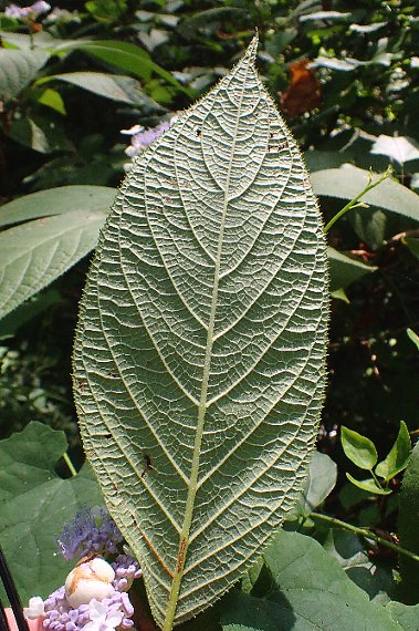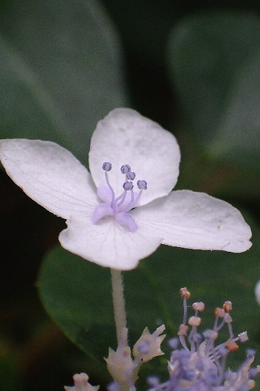 山地の湿った沢筋などに生える落葉低木で、高さは2メートルほどになる。葉は対生し、長い柄があって長楕円形〜倒卵形、先は尖り、両面に毛があってざらつく。 枝先に散房花序を広げる。蕾は花序全体が総苞に包まれて球状となる。中心部の両生花は淡紫色で、花弁や萼片は4〜5個。花は咲くとすぐに散り始めてしまう。周囲の装飾花は直径20〜30ミリ。花期は7〜9月。本州宮城県〜岐阜県の主に太平洋側に分布する。 〜徒然想〜 丸い玉がポンと弾けるように、大きく花を開きます。葉の上には、まだ弾けた総苞が残っています。あの丸い玉の中に、どのようにして大きな花が収まっているのか、不思議に想います。 どちらかというと、暗い湿った登山道で出逢うことが多く、そんな中でも、この花はうす紫色の花を、ときに色濃く浮かび上がらせます。 −同じ科の植物− |