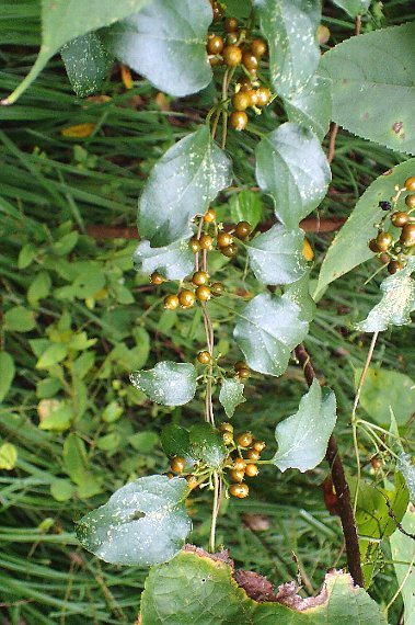 日当たりのいい籔、林縁、草地などに生えるつる性の多年草。茎は他の植物などに絡み付いて長く伸び、基部は木質化する。葉は対生し、広卵形〜披針形まで変化があり、先は短く尖り、基部はやや心形。