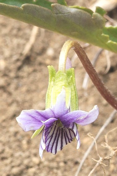 スミレとエイザンスミレの交雑種。 〜観察結果〜 葉は三角状披針形で不規則に切れ込みがある。基部は心形。花は淡紫青色〜紫青色で、唇弁中央部は白色で濃紫青色の筋がある。直径2センチほどで、エイザンスミレより小さい。側弁の基部は有毛。距は扁平筒形で淡紫青色〜紫青色。葉柄と花茎は多毛。 〜徒然想〜 4/1日に訪れたときの蕾は開花し、開花していた花は虫に食われたように衰退していました。従って、4/4日に撮影した花が新鮮で、実色を示しているでしょう。紫青色です。スミレの血が濃い個体と言えるのではないでしょうか。 側弁の基部には毛があり、葉は切れ込みがあります。但し、この切れ込みには異論をはさむ余地はあります。単なる虫食いともとられるかもしれません。 しかし、すぐ傍らには典型的な切れ込みの葉があり(下の画像。この個体は花芽なし)、観察者7人の総意でエドスミレと判定されました。 崩れやすい傾斜地に咲き、非常に不安定です。今後も残っていくだろうか、気がかりです。 とはいえ、移植するのは植栽化するようで、好みではありません。 −同じ科の植物− |