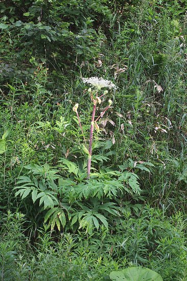 | 海岸〜山地の草地や道端などに生える多年草で、高さは1〜3メートル。茎は中空で太くて直立し、上部で枝を分ける。葉は2〜3回3出複葉で、小葉は羽状に分裂し、裂片は長楕円形で鋸歯がある。葉柄の基部は鞘状に膨らむ。 花は複散形花序になり、白色の小さな花を多数付ける。花期は7〜8月。北海道〜本州中部地方以北に分布する。 〜徒然想〜 実に壮大な植物でした。セリ科で最大級といってもいいでしょう。背丈をはるかに超え、茎は太く直径10センチほどもあるように思えました。 それらが農道脇に群生して屹立する姿をみると圧倒され、ああ北海道に来たのだとの想いでした。 エゾノヨロイグサも同様に農道脇でよく見られましたが、こちらは茎がより細く、背丈は小さかった(それでも1.5〜2メートルほど)。 −同じ科の植物− |