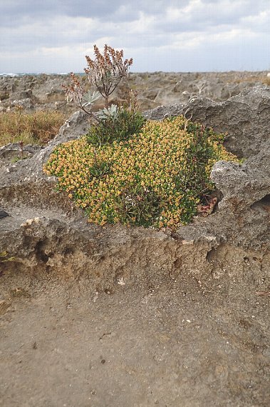 海岸の岩上などに生える多年草で、高さは2〜5センチ。茎はよく分枝して這いながら広がる。葉は対生し、へら状倒卵形、質は厚くて光沢があり、先は鈍頭。 花は葉腋に短い穂状となり、淡紅色で丸く集まって付く。花被片は楕円形で5枚、雄しべは5本。花期は7〜11月。和歌山県、九州薩摩半島以南〜沖縄県に分布する。 淡紅色の花が淡黄色になったものは、品種扱いでキバナイソフサギとされる場合がある。 〜徒然想〜 隆起サンゴ礁の海岸です。鋭く尖った岩場が広がり、奥には大きな海が続いています。 こんな潮風がかぶる岩場でも、植物はたくましく生を持っています。キバナイソマツやモクビャッコウの咲き終わりが点々と見られます。そして、キバナイソフサギがそこかしこで岩を覆っています。 ここでは花が紅いイソフサギは2つの群落だけが見られました。 群落は目立つものの、花は小さく、咲いているのかよく分かりません。目を近づけると花の先少し開き、黄色い雄しべが見えるものがあります。 花は咲いているのです。 -同じ科の植物- |