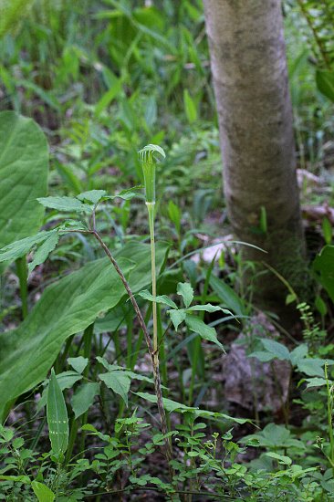 とほぼ同長又は長い。 仏炎苞は緑色で、舷部から筒部にかけて数本の白条がある。舷部は卵形〜狭卵形で、しばしばドーム状に盛り上がり、白筋が広がって半透明となり、鋭頭〜鋭尖頭、内面に隆起する細脈がある。付属体は淡緑色〜淡黄色、細棒状、直立又は上部でやや前に曲がる。花期は5〜6月。本州近畿地方以北〜北海道に分布する。 〜徒然想〜 北海道では、公園といえども自然状態の所が多く、本州では山地に入らないと見られないコケイランやトケンランなどが当たり前に生えています。 ベニバナヤマシャクヤクもこの公園内で見られたということで探しましたが、残念ながらみつかりませんでした。 本画像はこの公園林内で撮影したものですが、マムシグサにしてはちょっと細身で、マムシグサとは違うかなと感じ撮影しておいたものです。 調べると、北海道ではコウライテンナンショウと呼ばれるマムシグサの一型があるようです。広義のマムシグサに含むとする考え方もあります。 せっかく、ちょっとマムシグサとは違うかなと感じたので、本種の名をアップすることにしました。 |