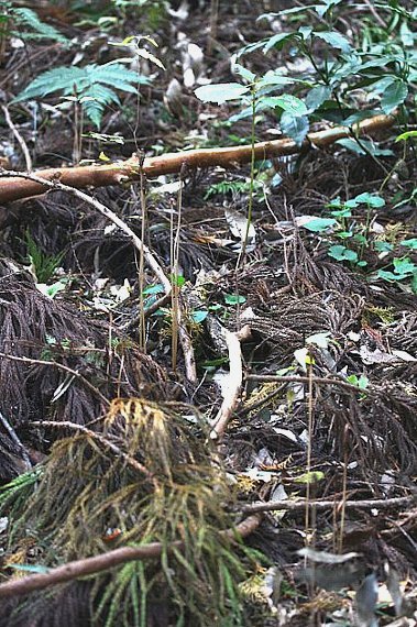 | 杉林下、竹林下などに生える腐生植物で、高さは5センチほど。果実期には、花茎が30センチほどにも伸びる。 花は茎頂に数個密集して付き、暗紫褐色。萼片は直径1センチほどで、外側はやや滑らかで少し横に開く。花期は9〜10月。本州関東〜中部地方、四国、九州に分布する。 〜徒然想〜 この花を見るまでに、4年間かかりました。 1年目、2年目は、この辺りにあると教えられ、花期に訪れ目を皿のようにして探しましたが、みつかりませんでした。 3年目はもう少し具体的な場所を聞いて、同様に探しましたが、これまたみつかりません。本当にみつけることが難しい植物です。 諦めて、同年11月の果実期に場所を確認しておくことにしました。何んということはありません。その場所には100本以上もの果実が立ち上がっていました、中には50センチほどのものや、10数本の束になっているものがみられます。 なぜみつけられなかったのか、不思議なほどです。花期には枯葉に紛れていたり、その下に隠れていたりするのですから無理もないのかもしれません。 翌年4年目の9月が待ち遠しかったのは、言うまでもありません。 −同じ科の植物− |