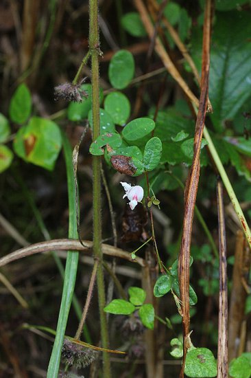 | 低山地や丘陵の草地、道端などに生える落葉小低木で、高さは30〜60センチ。茎は細くて硬く、よく分枝する。葉は3出複葉で、頂小葉は長楕円形で、先に刺状の突起がある。 花は長い花茎の先に短い総状花序となって2〜5個付き、長さ5〜10ミリの蝶形、白色で、花弁の根元に紅色の班が入る。節果は広卵形で、長さ3〜4ミリ。花期は8〜9月。本州〜沖縄県に分布する。 〜徒然想〜 軽自動車でもすれ違いが難しい山間の道を、奥へ奥へと進みます。前から車が来ないか、ハラハラドキドキです。 気疲れした頃、田んぼの脇に車が止まりました。マキエハギがある場所ということで、田んぼの脇の法面を探します。 みつかりましたが、花は一つだけでした。同行者は諦め顔で、さっさと引き揚げますが、私にとっては初見の花です。急ぎかつブレないよう慎重に撮影しました。三脚が立て難い場所でしたが、何とか撮影できたようです。花弁の下の赤色がかわいい花でした。 さて、次はカシノキランの場所に向かいます。 −同じ科の植物− |