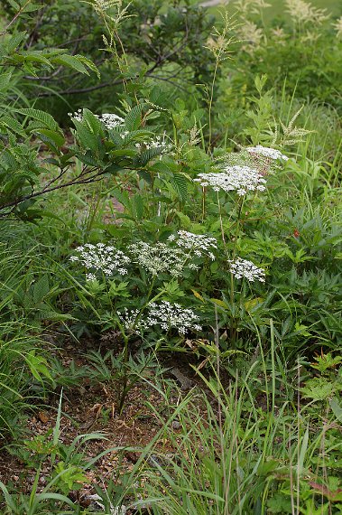 | 低山〜亜高山帯の岩上や草地などに生える多年草で、高さは20〜50センチ。トウキの高山型で、トウキより葉の幅が広い。葉は2回3出複葉で、表面に光沢がある。葉柄は鞘状に膨らみ基部は茎を抱く。 枝の先の複散形花序に多数の花を付ける。花は白色で5弁、直径3ミリほど。総芭片葉は普通0〜1個、小総芭片は数個ある。花期は7〜8月。本州滋賀県以北〜北海道に分布する。 〜徒然想〜 セリ科の見分けは難しく、未だに未同定種としてお蔵入りになっている画像が多くあります。しかし、セリ科の植物に接する機会が増えると、徐々にでも分かるようになってきます。 本種は、比較的背丈が低く(50センチほど)、光沢のある葉を持つので、比較的見分けがし易いかもしれません。 八方尾根など、よく知られた花の観察地での報告があることも、同定の手助けになります。 北海道では、海岸の岩場に生えていました。本州では亜高山に生える植物が海岸に生えるとは〜さすがに北の地です。 ただ、画像を図鑑等と比べてみると葉幅がホソバトウキと中間的なものも見られました。 −同じ科の植物− |