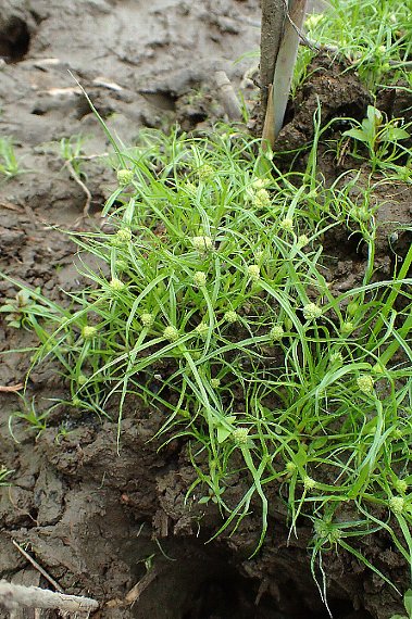 川岸、湖岸などの湿地に生える1年草で、高さは20センチほどになる。叢生し、葉は茎より短く、基部の鞘は赤紫色。苞葉は3〜6個あり、葉状で花序より長い。 花序は集まって丸い頭状となる。小穂は狭卵形、長さ3〜5ミリ、白緑色でやや扁平、2列に鱗片を付ける。鱗片は鋭頭。果実は細い楕円形で、縁に狭く白い翼がある。柱頭はふつう2岐する。花(果)期は7〜11月。北海道、本州に分布する。 〜徒然想〜 カヤツリグサ科らしいのですが、こんな姿のものは初めてです。花序は立ち上がらずに、地べたに貼り付く茎の先端にボール状になって付いています。 ここは、秋になり水嵩が下がった用水路です。 キタミソウを求めて砂泥地を探したのですが、開花したものは見つかりませんでした。でも、オオメナモミ、コイヌガラシなど、何の変哲もない河川敷は賑やかです。 −同じ科の植物− |
