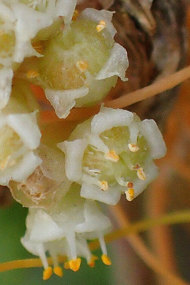 花は鱗片の腋に小さな集散花序を出し、頭状に多くの花を付ける。花冠は白色、広鐘形で5裂し、直径3ミリほど。花期は7〜10月。日本全土に帰化している。