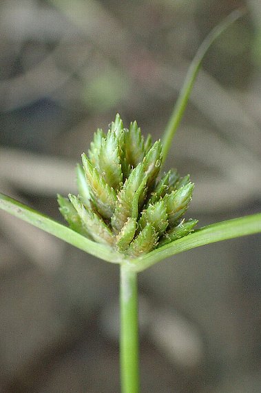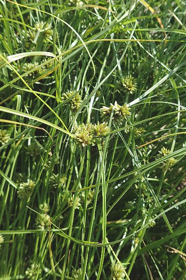 花序は小穂が多数密生した頭状花序、径1〜2.5センチ。苞は2〜3個付き、長い葉状。小穂は扁平で披針形〜狭卵形、淡緑色、長さ3〜7ミリ、幅5〜2ミリ。小花は2列に並び、10〜30個付く。鱗片は卵形で薄い膜質、長さ1.7〜2ミリ、鋭頭。花 (果)期は8〜10月。本州〜九州に分布する。