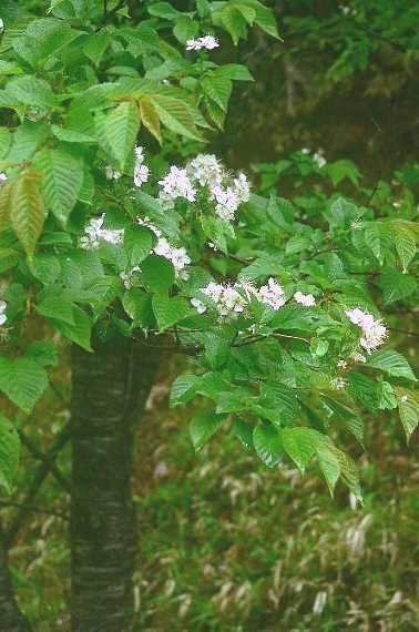 | 山地に生える落葉高木で、高さは10〜15メートル。葉は単葉で互生し、広卵形又は楕円形、縁には重鋸歯があり、葉先は鋭尖頭。側脈は8〜12対あり、目立つ。 枝先に散状花序を出し、直径1〜1.5センチの白い花を多数付ける。果実は小さい小豆状で、赤く熟す。花期は4〜6月。北海道〜九州に分布する。 〜徒然想〜 観察時は名前が分からなかった植物を、改めて同定しています。 植物に興味を持ち始めた初期と比べると科が予測できるようになり、調べる範囲が狭まっていることを実感しています。 多くの植物を見ることにより眼が育ってきていると感じてはいるのですが、まだまだです。 特に、木々の花は敬遠気味でしたので、撮影したとしても記録程度の撮影で、花、葉、枝、幹などの細かいところは撮影していません。画像も鮮明ではありません。後で同定するには難しい画像が多く残っています。 言い訳ばかりの〜徒然想〜になってしまいました。 富士山麓では、オオウラジロノキとも思いましたが、本種でいいのではないかと考えました。 −同じ科の植物− |