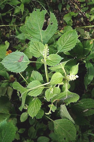 東南アジア原産の逸出帰化植物。道端、沢沿い林縁などに生える1年草で、高さは50〜100センチ。全体に毛があり、不快な臭いがある。葉は対生し、卵形〜広卵形で、長い柄があり、縁には鋸歯がある。