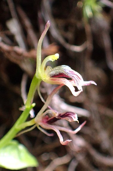 花は茎頂の総状花序に3〜4個付く。苞は卵形で、長さ1.5ミリほど。背萼片と側萼片は披針形、淡黄緑色、長さ4ミリほど。側花弁は糸状で後方に巻き、長さ5ミリほど。唇弁は倒卵形、暗紫色で紫褐色の筋が入り、長さ4ミリほど、先は微細な突起があり、基部はくぼんで、中部から先はやや内巻きになる。蕊柱は内側に湾曲し黄色、葯は卵形。花期は6〜7月。本州(岩手・栃木・山梨・長野県)に分布する。
