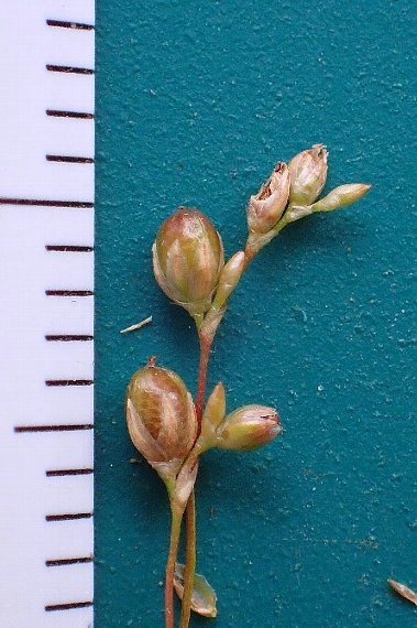 花序は長さ5〜15センチで、花序軸は扁平。花被片は6個付き、披針形、鋭頭、辺縁は膜質。雄しべは3個。果実(刮ハ)は長さ2ミリほどの卵状球形。花期は5〜6月。
