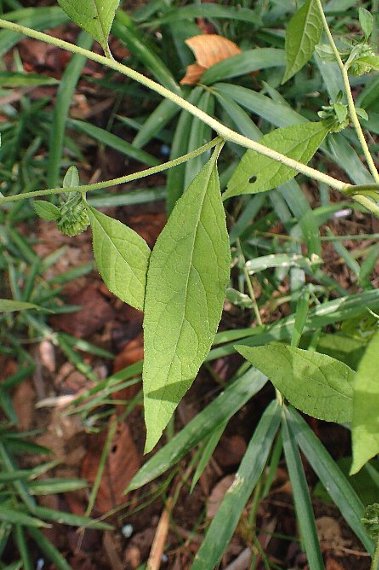 山野の草地、林下、林縁などに生える多年草で、高さは50〜100センチ。茎はよく分枝し、茎、葉、萼には白い軟毛が密生する。根出葉は花時には枯れ、下部の葉はさじ状長楕円形、先は鋭頭、基部はくさび形で翼のある葉柄に流れ、縁には不揃いの細かい鋸歯がある。上部の茎葉は次第に小さくなる。