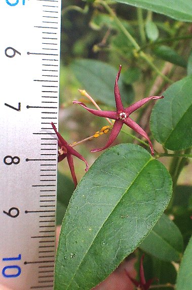 花は葉腋から出た長さ1〜2cmの花柄の先に散状に2〜数個付き、暗紫色を帯び、直径15〜20ミリ。花冠裂片は細長く、副花冠の裂片はやや扁平。花期は7〜9月。関東〜近畿地方に分布する。