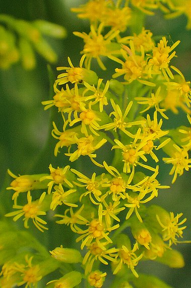 頭花は枝先に大きな円錐花序となり、黄色で直径6ミリほどの花を多数付ける。総苞は長さ3〜5ミリ。舌状花は10〜18枚、筒状花は3〜5個。花期は10〜11月。