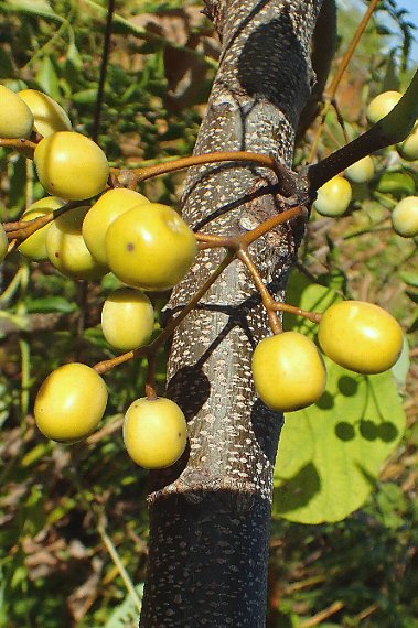 果実は緑色から秋になると黄色に熟し、葉が落ちても実は残ります。果実はサポニンを含み、人や動物には有毒で、注意が必要です。