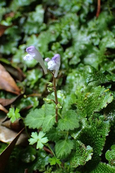 コケの中に小さなタツナミソウの仲間が見えました。ヤクシマシソバタツナミソウでしょう。予想しつつも、期待していなかった花です。