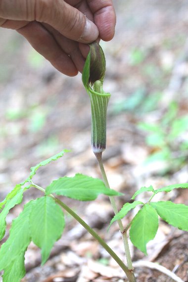 山地の林下などに生える多年草で、高さは50〜80センチ。偽茎の長さは変異が大きく、しばしば全体の高さの1/2まで短くなる。鞘状葉や偽茎部は淡緑色〜淡紫褐色で斑がある。葉は2個で、小葉は長楕円形、不揃いな鋸歯があることが多い。 花は雌雄偽異株。仏炎苞は葉の展開の後に開き、筒部はやや太い筒状で淡色、口辺部はほとんど開出しない。舷部は三角状広卵形でドーム状に盛り上がり、先は短く尖り、光沢がなく、普通外面が緑色、内面が紫褐色で白条があり、時に緑色。付属体は棒状、仏炎苞の舷部に隠れ目立たない。花期は5〜6月。中部、関東地方に分布する。 〜徒然想〜 カルイザワテンナンショウを探していると、仏炎苞が幅広く、前に垂れているテンナンショウを見かけることが多くなりました。カントウマムシグサの変異の範囲内と思いながらも、撮っておくことにしました。 調べると、ヤマジノテンナンショウのようです。仏炎苞の外側が緑色で、内側が暗紫色であるのが特徴です。さらに仏炎苞が三角状広卵形(幅広い)で白条が目立ち、付属体が仏炎苞に隠れ気味なのが特徴です。 眠っているサトイモ科のフォルダから画像を探すと・・・・・・、みつかりました。当初は同定できず、眠っていた画像です。 また一つ、眠りから起こすことができました。初見の花をみつけたように、うれしいものです。 なお、カルイザワテンナンショウの同所では、花序全体や仏炎苞舷部の外面が紫色の筋が多いもの、舷部の内面が緑色のものもみつかりました。また、舷部が長く伸びるものも見つかりました。これらがヤマジノテンナンショウの変異の範囲なのか、カルイザワテンナンショウとの交雑があるのか、定かではありません。Photo Gallery参照 −同じ科の植物− |
