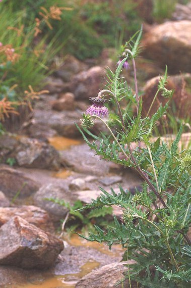 山地〜亜高山帯の蛇紋岩混じりの草地に生える多年草で、高さは40〜60センチ。 頭花は長い枝の先に1つ下向きに付け、総苞片は粘らず、斜上又は平開する。花期は8〜10月。八方尾根に分布する。 〜徒然想〜 このアザミは、やけに大きく鮮やかで、ずいぶんと見入ったことが思い出されます。八方尾根に特産するハッポウアザミと思われ、出逢ったことに感謝する。まだ咲き始めなのか、それほど数は見られず、2株だけだった。頭花の直径は6センチほど、高さは60センチほどでした。 前年、アップの準備をしていたところ、写真が疑わしくなり、アップ見送りとしていました。 これを確かめたくて、白馬岳からの帰り道、八方に向かいます。 登山道脇にデンと構えたアザミに出逢います。鋭い切れ込みを持つ葉と大きな頭花、これがハッポウアザミと確信して撮りましたが、じっくり見ていると、・・・ またもや疑いが出てきます。 オニアザミだったようです。アザミは難しい! −同じ科の植物− |