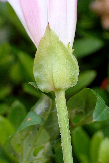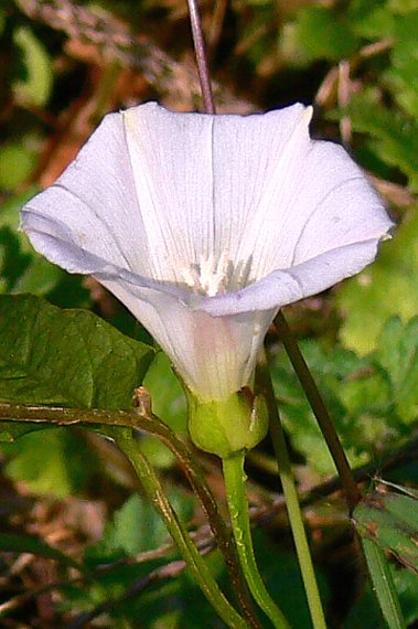 野原や道端に生える多年草で、他の植物などに巻きついてのびる。葉は葉柄があり、三角状ほこ形で、側裂片は浅く2裂する。 花冠は淡紅白色で、長さ3〜3.5センチ、直径3〜4センチ、花柄は長さ2〜5センチ。花柄の上部には縮れた狭い翼がある。花期は6〜8月。本州以南に分布する。 〜徒然想〜 12月ともなると関東近辺の山にはほとんど花がなくなり、寂しい想いになります。 そんなときでも、陽射しのあるときは近くの河原などに出かけます。あてはありません。 いつもよりなお一層ゆったりと歩を進めると、思いがけない花に出逢えることがあります。このコヒルガオもその一つでした。花期はふつう6〜8月ですが、陽当たりのいい河原に1輪だけ花開いていました。 早春に咲くホトケノザも冬場に返り咲くことが多いです。 ヒルガオとコヒルガオ、その交雑種といわれるアイノコヒルガオの違いを調べてみました。 コヒルガオは、花が小さめで五角形、苞はやや短く先端が尖る、花柄には波打った明確な翼があるなどが特徴です。 −同じ科の植物− |