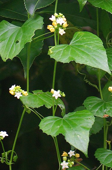 低地〜山地の林縁や荒地に生える、長さ3〜5メートルになるツル性の1年草。葉は広卵形〜円心形で粗い鋸歯があり、上面はざらつく。 雌雄異株で、花は白色(のち黄色)。花期は11月〜春?。果実(液果)は広楕円形で、暗緑色に熟する。奄美大島〜沖縄県に分布する。 〜徒然想〜 今回も聞き慣れない植物に出逢うことになりました。クロミノオキナワスズメウリ。アレチウリに似たツル性の植物です。立木に絡んで垂れ下がっています。 花は白、単独で見るとなかなかきれいなのですが、関東でも野にはびこるアレチウリを連想してしまい、身を入れての撮影にはなりませんでした。 −同じ科の植物− |