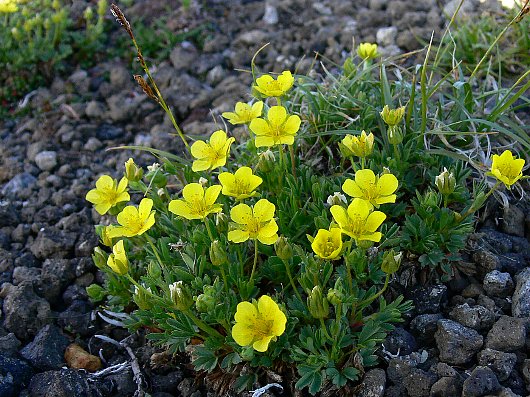 北海道の高山帯砂礫地に生える多年草で、高さ3〜10センチ。全体に黄褐色の伏毛がある。葉は3出葉、小葉はくさび形で先端に3個の粗い鋸歯がある。 花は直径1.5センチほどで、黄色、花茎の先に数個付ける。花弁は倒卵形で円頭。花床には長毛が密生する。花期は7〜8月。 〜徒然想〜 花は、クリーム色を帯びた黄色というのでしょうか、緑色を帯びた黄色というのでしょうか、いずれにしても上品な黄色です。 掌形の小葉は白みのある緑で、小さくて可愛らしい。 大地の各所で咲き誇り、短い夏を喜ぶように、小刻みに風に揺れています。メアカンキンバイ、蝦夷の地の花にふさわしい名をもちます。初めて出逢いで、すぐにこの花が好きになりました。 茎の下部が木質化するからでしょうか、小低木とする記載があります。 −同じ科の植物− |