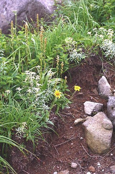 別名ヒナウスユキソウ。 高山帯の草地に生える多年草で、高さ4〜15センチ。無花茎と有花茎の区別がある。根出葉はロゼッタ状で倒披針形、茎葉は線形で、いずれも灰白色の綿毛がある。 頭花は2.5〜5センチの苞葉の上に密に付き、苞葉や総苞には白い綿毛が密生する。花期は6〜8月。東北地方の高山に分布する。 〜徒然想〜 少し前に見たホソバヒナウスユキソウの母種に出逢えると聞いて、ほんとに今度の遠征が楽しみになりました。登山自体はハードでないのも、気持ちを軽くします。 目的の花はすぐに現れました。歩を進めるに従って、好みのロケーションで次々に現れます。うれしい時間の連続です。 想い返せば、ホソバヒナウスユキソウはやはり華奢な姿でした。高山に咲く姿が重なります。 さあ、次は近似種のハヤチネウスユキソウ、岩場で風に揺れる姿を撮りたいですね。来年以降です。 −同じ科の植物− |