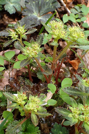 ヨゴレネコノメと同じくイワボタンを母種とする高さ5〜15センチの多年草。ふつう根出葉は花時にはなく、花後に30センチにも達する走出枝を出す。 萼片は淡黄色で花期にはほぼ平開し、雄しべは8個。開裂直前の葯は暗紅紫色。花期は4〜5月。東北地方南部〜中部地方の太平洋側に分布する。 〜徒然想〜 ヨゴレネコノメとの違いがよく分からなくて、アップを先延ばしにしていました。図鑑などには、萼片が平開する、葯が4〜8個で暗紅紫色などの特徴が示されています。 しかし、萼片がまだ平開しきれていない初期のものがあったりすると、即、迷いになってしまいます。 少し救われつつあるのは、数を見ることによって、典型的なものと、そうでないものとを見分ける目が、多少なりとも出来てきたことでしょうか。植物によって、見なければならない部分が分かってきたことでしょうか。 違いは、ヨゴレネコノメの萼片はほぼ直立し、葯は暗紅色、花糸、花柱及び子房が紅紫色を帯びることを、指標にしています。 母種のイワボタンの葯は黄色です。 −同じ科の植物− |