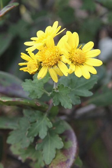 別名アブラギク。日当たりのよい山野に生える多年草で、高さは30〜80センチ。茎の下部は倒れ、上部は立ち上がる。葉は3〜5中裂し、基部は切形〜くさび形、裏面には丁字状毛があり淡緑色。 頭花は黄色で直径1.5〜3センチと幅がある。総苞は半円球で総苞片の外片は長楕円形〜卵形。花期は10〜12月。近畿地方以西、四国、九州に分布する。 〜徒然想〜 訪れた北九州や山口の海岸付近では、そこかしこにふつうに見られました。アワコガネギクをそのまま小さくしたような黄金色で、きれいです。花の直径は2センチほど、ときに3センチほどのものもみられます。 この花との雑種にサンインギクが知られています。花仲間が周辺を探し、それらしきものをみつけて花談義です。結局、それはサンインギクとは言い切れないと判定されたようですが、さすがに皆さん熱心です。私としては、輪の外から聞き耳を立てるだけです。 海岸に咲く花には、やはり青い海が似合います。イメージしていたロケーションを探したのですが、今回は想いの場所には行き当たりませんでした。またの機会を楽しみにすることにします。 −同じ科の植物− |