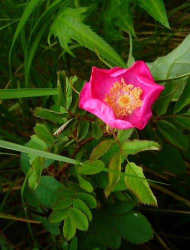 別名タカネイバラ。亜高山帯〜高山帯の岩場、草地などに生える落葉低木で、高さは1〜2メートル。枝はよく分枝する。葉は奇数羽状複葉で小葉は3〜4対、楕円形〜倒長卵形で、先はやや円く、縁に鋭い鋸歯がある。質は薄く、表面は緑色、裏面は白色を帯びる。