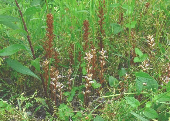 ヨーロッパ原産の1年生の寄生植物で、高さ20〜50センチ。マメ科、セリ科、キク科などの植物から養分を吸収し、春から夏にかけて地上に出現する 。葉緑素をもたず、茎は褐色の腺毛を密生して直立し、高さ20〜50センチになる。 〜徒然想〜 観察会に同行したY先生〜同じ名字なので、先生をつけて呼ぶことにした。植物歴ん十年の大家です〜が帰化性の寄生植物であると説明してくれました。 草の間に茶色い柱がにょきにょきと生え、変な風情です。 遠方からの参加者も興味深げに覗き込みますが、そこまでです。あまり熱心に撮影する気にはならなかったようです。 近場の多摩川河川敷でも群生が見られました。 やはり、最初の印象は変わりません。熱心に撮影する気にはなりませんでした。 −同じ科の植物−