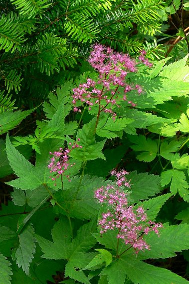オニシモツケの葉はシモツケソウに似て掌状に切れ込みますが、花は白色で、高さが2メートル以上にもなりずっと大型です。